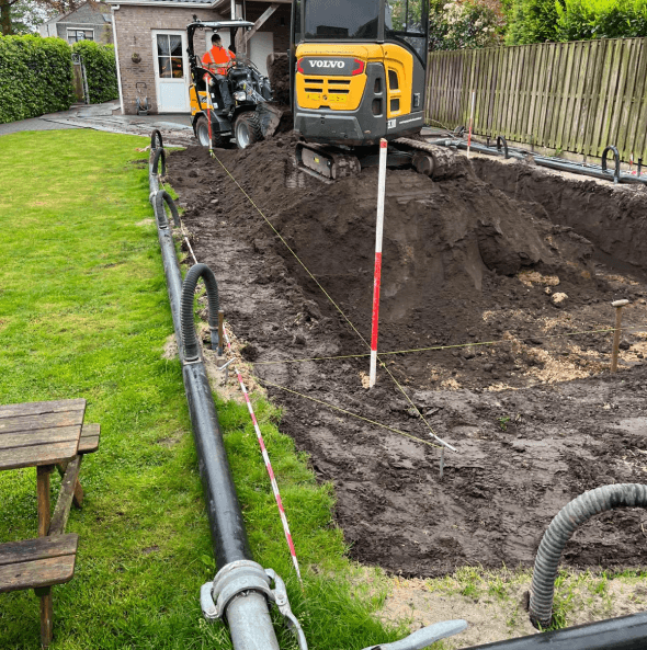Voor al uw grondwerk, tuinaanleg en bestrating groot of klein kunt u bij ons terecht. Bijvoorbeeld voor het uitgraven van vijvers, zwembaden en trampolines. Ook het graven van sleuven voor leidingen, het leggen van riolering/drainage en het uitgraven van nieuw te bouwen objecten behoort tot de mogelijkheden.